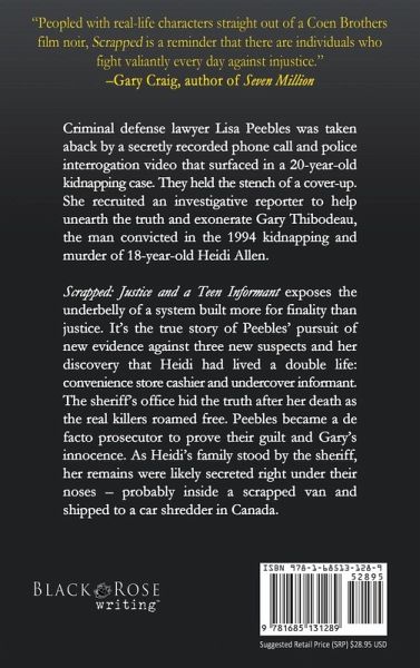 "Scrapped captures the barren roads and fallow fields of Oswego County the way Capote captured Finney County, Kansas in In Cold Blood." -Tom Barbash, New York Times bestselling author of The Dakota Winters Criminal defense lawyer Lisa Peebles was taken aback by a secretly recorded phone call and police interrogation video that surfaced in a 20-year-old kidnapping case. They held the stench of a cover-up. She recruited an investigative reporter to help unearth the truth and exonerate Gary Thibodeau, the man convicted in the 1994 kidnapping and murder of 18-year-old Heidi Allen. Scrapped: Justice and a Teen Informant exposes the underbelly of a system built more for finality than justice. It's the true story of Peebles' pursuit of new evidence against three new suspects and her discovery that Heidi had lived a double life: convenience store cashier and undercover informant. The sheriff's office hid the truth after her death as the real killers roamed free. Peebles became a de facto prosecutor to prove their guilt and Gary's innocence. As Heidi's family stood by the sheriff, her remains were likely secreted right under their noses - probably inside a scrapped van and shipped to a car shredder in Canada.