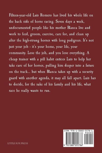 Fifteen-year-old Luis Romero has lived his whole life on the back side of horse racing. Seven days a week, undocumented people like his mother Blanca live and work to feed, groom, exercise, care for, and clean up after the high-strung horses with long pedigrees. It's not just your job - it's your home, your life, your community. Lose the job, and you lose everything. A cheap trainer with a pill habit entices Luis to help her take care of her horses, pulling him deeper into a future on the track... but when Blanca takes up with a security guard with another agenda, it may all fall apart. Luis has to decide, for the sake of his family and his life, what race he really wants to run.
