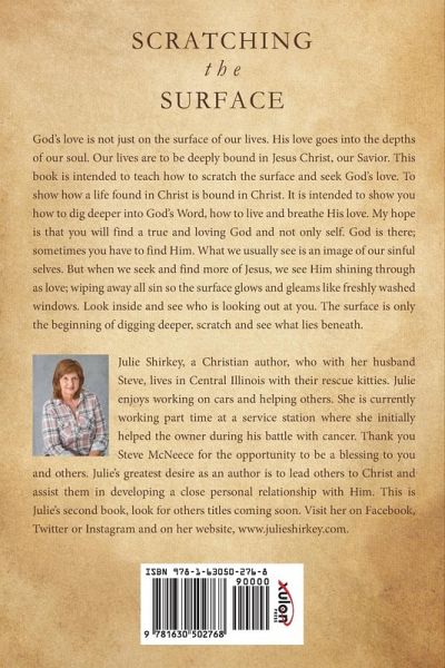 God's love is not just on the surface of our lives. His love goes into the depths of our soul. Our lives are to be deeply bound in Jesus Christ, our Savior. This book is intended to teach how to scratch the surface and seek God's love. To show how a life found in Christ is bound in Christ. It is intended to show you how to dig deeper into God's Word, how to live and breathe His love. My hope is that you will find a true and loving God and not only self. God is there; sometimes you have to find Him. What we usually see is an image of our sinful selves. But when we seek and find more of Jesus, we see Him shining through as love; wiping away all sin so the surface glows and gleams like freshly washed windows. Look inside and see who is looking out at you. The surface is only the beginning of digging deeper, scratch and see what lies beneath. Julie Shirkey, a Christian author, who with her husband Steve, lives in Central Illinois with their rescue kitties. Julie enjoys working on cars and helping others. She is currently working part time at a service station where she initially helped the owner during his battle with cancer. Thank you Steve McNeece for the opportunity to be a blessing to you and others. Julie's greatest desire as an author is to lead others to Christ and assist them in developing a close personal relationship with Him. This is Julie's second book, look for others titles coming soon. Visit her on Facebook, Twitter or Instagram and on her website, www.julieshirkey.com.
