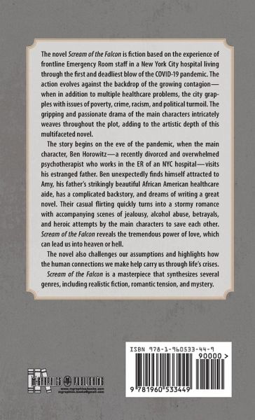 The novel Scream of the Falcon is a fiction based on the experience of frontline Emergency Room staff in a New York City hospital living through the first and deadliest blow of the COVID-19 pandemic. The action evolves against the backdrop of the growing contagion-when in addition to multiple healthcare problems, the city grapples with issues of poverty, crime, racism, and political turmoil. The gripping and passionate drama of the main characters intricately weaves throughout the plot, adding to the artistic depth of this multifaceted novel. The story begins on the eve of the pandemic, when the main character, Ben Horowitz, a recently divorced and overwhelmed psychotherapist who works in the ER of an NYC hospital, visits his estranged father. Ben unexpectedly finds himself attracted to Amy, his father's strikingly beautiful home healthcare aide, who is African American and has a complicated backstory. Amy's dream is to write a great novel. Their casual flirting quickly turns into a stormy romance with accompanying scenes of jealousy, alcohol abuse, betrayals, and heroic attempts by the main characters to save each other. Scream of the Falcon reveals the tremendous power of love, which can lead someone's life into heaven or hell. The novel also challenges assumptions and highlights how tenacity, fortitude, and the human connections we build help carry us through life's crises and make us who we were meant to become. Scream of the Falcon is a masterpiece with a unique synthesis of several genres, including realistic fiction, romantic tension, and mystery.