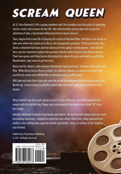 At 23, Vera Horowitz's life is going nowhere until she stumbles into the path of a speeding tractor-trailer and screams for her life. Her otherworldly scream does not escape the attention of Jake, a handsome Hollywood horror movie director. Thus, begins Vera's new life of playing the victim at Falchion Films. But Vera is no victim, as Jake sees when she stands up to Barry, the misogynistic producer. Pretty and petite, Vera draws a depraved fan base and the jealousy of two aging "scream queens." Jake falls for Vera, but her innocence makes him question why he makes movies that debase women. Their love grows until Vera learns disturbing facts about his past and breaks up with him. Heartbroken, Jake vows to get her back. Barry and his cohorts, who envision themselves "apex predators," become darker with each film. When Barry learns Vera is a virgin, his ultimate fantasy, to capture an actual virgin sacrifice on screen and sell the film on the dark web, is within reach. Will Jake win back Vera's love and save her, or will Vera become Barry's fantasy come true? Buckle up. Scream Queen is a thriller which rides the razor's edge between horror and humor.
