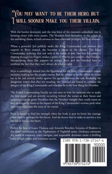 You may want to be their hero, but I will sooner make you their villain. With the barrier destroyed, and the true force of the monsters unleashed, war is looming closer with every sunset. The Verndari find themselves in the centre of the unfolding chaos, as both saviours to their allies and as targets for their enemies. When a powerful Jarl publicly snubs the King Commander and declares his support to Bryn instead, she becomes a threat to the throne. The King Commander, realizing that not only is his realm at risk, but that his power is slipping through his fingers, makes a point of what he can control - the Verndari. Manipulating them like puppets on strings, Bryn and the Verndari have to confront the fact that they can't always do what is right. Bryn is unwillingly turned into the figurehead for the King Commander's unjust decisions making her the peoples enemy. But she refuses to be the villain he wants her to be and actively works against his agenda however she can. Realizing the dangerous waters that they are treading, the Verndari are forced to consider the dangers of the King Commander and whether he is the best thing for Drysden. The Exiled Commanding Family are not ones to wait for someone else to make the first move and are actively recruiting behind the scenes as their forces and supporters rapidly grow. Numbers that the Verndari thought they could count on may no longer be theirs as the impact of the King Commander's actions push what were once allies into the arms of the enemy. Bryn is forced to find her strength when her body is past its limit; her courage when there is no hope for the future. And she learns that in order to survive a war she has to harden her heart. Perfect for fans of Laura Thalassa and Amanda Bouchet, Screams of Shadows is the third instalment in the Nightmares of Nightfall series. Darkness consumes the world as romance, court intrigue, and impossible decisions create a thrilling story of high stakes and traitorous secrets.