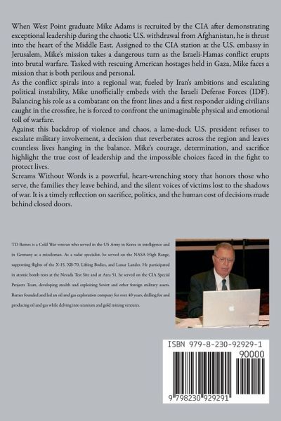 When West Point graduate Mike Adams is recruited by the CIA after demonstrating exceptional leadership during the chaotic U.S. withdrawal from Afghanistan, he is thrust into the heart of the Middle East. Assigned to the CIA station at the U.S. embassy in Jerusalem, Mike's mission takes a dangerous turn as the Israeli-Hamas conflict erupts into brutal warfare. Tasked with rescuing American hostages held in Gaza, Mike faces a mission that is both perilous and personal. As the conflict spirals into a regional war, fueled by Iran's ambitions and escalating political instability, Mike unofficially embeds with the Israeli Defense Forces (IDF). Balancing his role as a combatant on the front lines and a first responder aiding civilians caught in the crossfire, he is forced to confront the unimaginable physical and emotional toll of warfare. Against this backdrop of violence and chaos, a lame-duck U.S. president refuses to escalate military involvement, a decision that reverberates across the region and leaves countless lives hanging in the balance. Mike's courage, determination, and sacrifice highlight the true cost of leadership and the impossible choices faced in the fight to protect lives. Screams Without Words is a powerful, heart-wrenching story that honors those who serve, the families they leave behind, and the silent voices of victims lost to the shadows of war. It is a timely reflection on sacrifice, politics, and the human cost of decisions made behind closed doors.