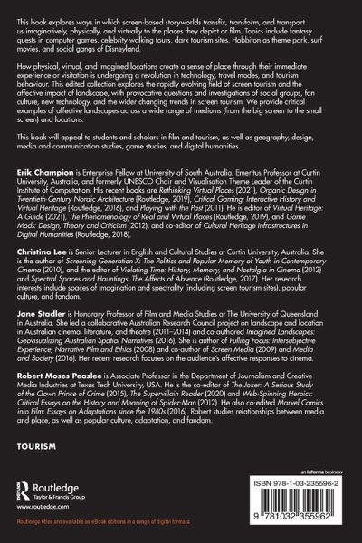 Erik Champion is Enterprise Fellow at University of South Australia, Emeritus Professor at Curtin University, Australia, and formerly UNESCO Chair and Visualisation Theme Leader of the Curtin Institute of Computation. His recent books are Rethinking Virtual Places (2021), Organic Design in Twentieth-Century Nordic Architecture (Routledge, 2019), Critical Gaming: Interactive History and Virtual Heritage (Routledge, 2016), and Playing with the Past (2011). He is editor of Virtual Heritage: A Guide (2021), The Phenomenology of Real and Virtual Places (Routledge, 2019), and Game Mods: Design, Theory and Criticism (2012), and co-editor of Cultural Heritage Infrastructures in Digital Humanities (Routledge, 2018). Christina Lee is Senior Lecturer in English and Cultural Studies at Curtin University, Australia. She is the author of Screening Generation X: The Politics and Popular Memory of Youth in Contemporary Cinema (2010), and the editor of Violating Time: History, Memory, and Nostalgia in Cinema (2012) and Spectral Spaces and Hauntings: The Affects of Absence (Routledge, 2017). Her research interests include spaces of imagination and spectrality (including screen tourism sites), popular culture, and fandom. Jane Stadler is Honorary Professor of Film and Media Studies at The University of Queensland in Australia. She led a collaborative Australian Research Council project on landscape and location in Australian cinema, literature, and theatre (2011-2014) and co-authored Imagined Landscapes: Geovisualizing Australian Spatial Narratives (2016). She is author of Pulling Focus: Intersubjective Experience, Narrative Film and Ethics (2008) and co-author of Screen Media (2009) and Media and Society (2016). Her recent research focuses on the audience's affective responses to cinema. Robert Moses Peaslee is Associate Professor in the Department of Journalism and Creative Media Industries at Texas Tech University, USA. He is the co-editor of The Joker: A Serious Study of the Clown Prince of Crime (2015), The Supervillain Reader (2020) and Web-Spinning Heroics: Critical Essays on the History and Meaning of Spider-Man (2012). He also co-edited Marvel Comics into Film: Essays on Adaptations since the 1940s (2016). Robert studies relationships between media and place, as well as popular culture, adaptation, and fandom.
