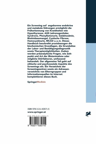 Ein Screening auf angeborene endokrine und metabole Störungen ermöglicht die Früherkennung von Krankheiten wie Hypothyreose, AGS (adrenogenitales Syndrom), Phenylketonurie, Galaktosämie, Biotinidasemangel, Cystische Fibrose oder Homocystinurie. Je nach Land und politischen Bestimmungen unterscheiden sich jedoch die routinemäßig durchgeführten Untersuchungen.Dieses Handbuch beschreibt praxisbezogen die biochemischen Grundlagen, die Grundsätze der Labor- und Bestätigungsdiagnostik sowie Therapiemöglichkeiten zu insgesamt zwölf Krankheiten. Darüber hinaus werden präanalytische Fragen, wie Zeitpunkt und Art der Blutentnahme oder mögliche Störfaktoren, umfassend behandelt. Der allgemeine Teil geht auf ethische und psychosoziale Aspekte des Screenings ein.Ein Verzeichnis der Screeningzentren und jener Labors, die für die Bestätigungsdiagnostik Dienste anbieten, sowie ein Adressenverzeichnis von Elterngruppen und Informationsquellen im Internet komplettieren dieses Buch.