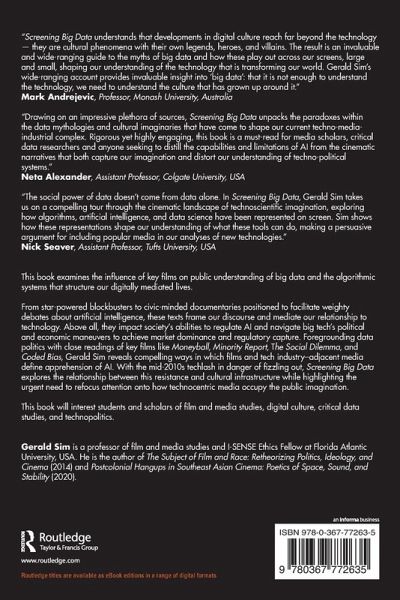 "The social power of data doesn't come from data alone. In Screening Big Data, Gerald Sim takes us on a compelling tour through the cinematic landscape of technoscientific imagination, exploring how algorithms, artificial intelligence, and data science have been represented on screen. Sim shows how these representations shape our understanding of what these tools can do, making a persuasive argument for including popular media in our analyses of new technologies." - Nick Seaver, Assistant Professor, Tufts University, USA