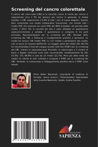Il cancro del colon-retto (CRC) è la seconda causa di morte per cancro e rappresenta circa il 9% dei decessi per cancro in generale. In Arabia Saudita, il CRC rappresenta il 9,9% di tutti i casi di nuova diagnosi. Questo libro comprende uno studio comparativo trasversale, che include tutti i medici PHC che lavorano nei centri PHC del MOH di Jeddah, nel periodo dello studio, il 2012. Per la raccolta dei dati è stato utilizzato un questionario autosomministrato e validato. Il questionario si compone di tre parti principali: Raccomandazioni per lo screening del CRC, Risultati dello screening del CRC e follow-up e Caratteristiche pratiche e personali. Lo studio ha incluso 106 medici PHC su 127 invitati a partecipare allo studio, con un tasso di risposta dell'83,5%. La maggior parte dei medici (91; 86,7%) ha raccomandato il test del sangue occulto nelle feci (FOBT) per lo screening del CRC, mentre la sigmoidoscopia flessibile, la colonscopia e il clistere di bario a doppio contrasto sono stati raccomandati rispettivamente da (56; 53,3%), (73; 68,9%) e solo da 23 medici (21,7%). Poco più della metà dei medici ha riferito di aver ordinato o eseguito il FOBT per lo screening del CRC. Pertanto, la conoscenza e l'atteggiamento positivo verso il FOBT sono elevati.