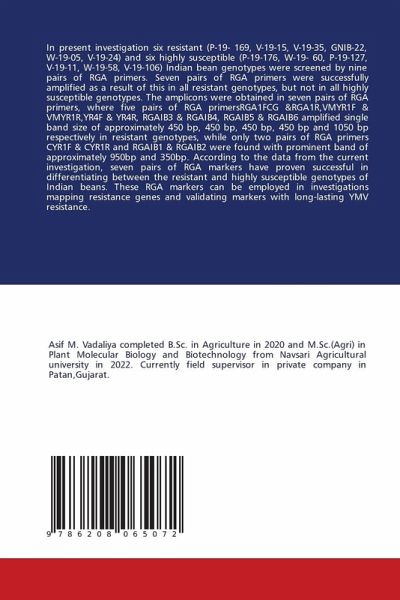 In present investigation six resistant (P-19- 169, V-19-15, V-19-35, GNIB-22, W-19-05, V-19-24) and six highly susceptible (P-19-176, W-19- 60, P-19-127, V-19-11, W-19-58, V-19-106) Indian bean genotypes were screened by nine pairs of RGA primers. Seven pairs of RGA primers were successfully amplified as a result of this in all resistant genotypes, but not in all highly susceptible genotypes. The amplicons were obtained in seven pairs of RGA primers, where five pairs of RGA primersRGA1FCG &RGA1R,VMYR1F & VMYR1R,YR4F & YR4R, RGAIB3 & RGAIB4, RGAIB5 & RGAIB6 amplified single band size of approximately 450 bp, 450 bp, 450 bp, 450 bp and 1050 bp respectively in resistant genotypes, while only two pairs of RGA primers CYR1F & CYR1R and RGAIB1 & RGAIB2 were found with prominent band of approximately 950bp and 350bp. According to the data from the current investigation, seven pairs of RGA markers have proven successful in differentiating between the resistant and highly susceptible genotypes of Indian beans. These RGA markers can be employed in investigations mapping resistance genes and validating markers with long-lasting YMV resistance.