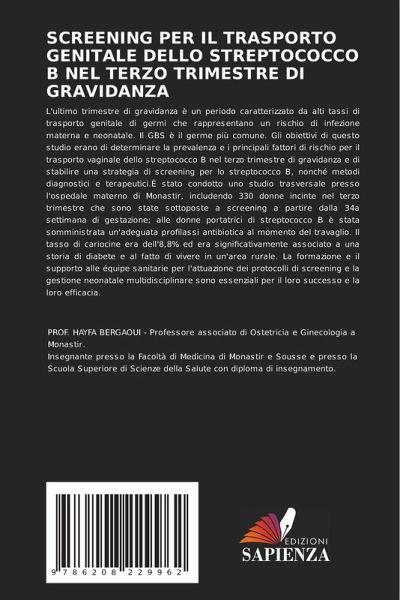 L'ultimo trimestre di gravidanza è un periodo caratterizzato da alti tassi di trasporto genitale di germi che rappresentano un rischio di infezione materna e neonatale. Il GBS è il germe più comune. Gli obiettivi di questo studio erano di determinare la prevalenza e i principali fattori di rischio per il trasporto vaginale dello streptococco B nel terzo trimestre di gravidanza e di stabilire una strategia di screening per lo streptococco B, nonché metodi diagnostici e terapeutici.È stato condotto uno studio trasversale presso l'ospedale materno di Monastir, includendo 330 donne incinte nel terzo trimestre che sono state sottoposte a screening a partire dalla 34a settimana di gestazione; alle donne portatrici di streptococco B è stata somministrata un'adeguata profilassi antibiotica al momento del travaglio. Il tasso di cariocine era dell'8,8% ed era significativamente associato a una storia di diabete e al fatto di vivere in un'area rurale. La formazione e il supporto alle équipe sanitarie per l'attuazione dei protocolli di screening e la gestione neonatale multidisciplinare sono essenziali per il loro successo e la loro efficacia.