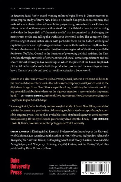 In Screening Social Justice, award-winning anthropologist Sherry B. Ortner presents an ethnographic study of Brave New Films, a nonprofit film production company that makes documentaries intended to mobilize progressive grassroots activism. Ortner positions the work of the company within a tradition of activist documentary filmmaking and within the larger field of "alternative media" that is committed to challenging the mainstream media and telling the truth about the world today. The company's films cover a range of social justice issues, with particular focus on the hidden workings of capitalism, racism, and right-wing extremism. Beyond the films themselves, Brave New Films is also famous for its creative distribution strategies. All of the films are available for free on YouTube. Central to the intention of promoting political activism, the films circulate through networks of other activist and social justice organizations and are shown almost entirely in live screenings in which the power of the film is amplified. Ortner takes the reader inside both the production process and the screenings to show how a film can be made and used to mobilize action for a better world.