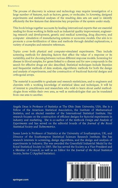 "The book provides a comprehensive and accessible overview of historical and modern screening approaches, including design generation strategies, analysis methods, visualization techniques, and gives many examples to illustrate the theory developed. ...The book is an important summary of the work of key researchers in this area and will be a valuable addition to the reference shelf of practioners and researchers alike." (Christine M. Anderson-Cook, Journal of the American Statistical Association, Vol. 102, No. 477, 2007)