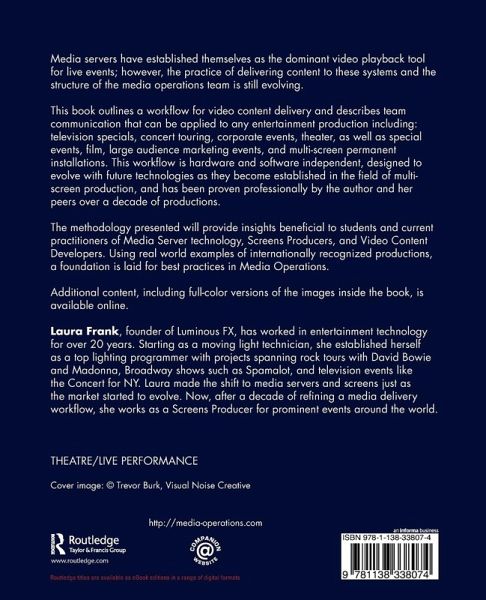 This book outlines a workflow for video content delivery and describes team communication that can be applied to any entertainment production including: television specials, concert touring, corporate events, theater, as well as special events, film, large audience marketing events, and multi-screen permanent installations. This workflow is hardware and software independent, designed to evolve with future technologies as they become established in the field of multi-screen production, and has been proven professionally by the author and her peers over a decade of productions.