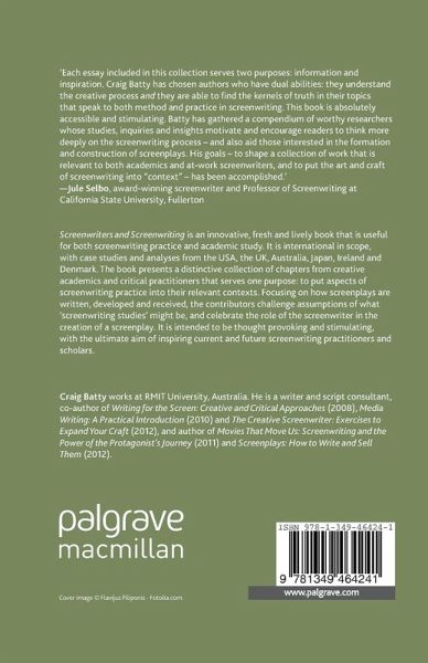 'Each essay included in this collection serves two purposes: information and inspiration. Craig Batty has chosen authors who have dual abilities: they understand the creative process and they are able to find the kernels of truth in their topics that speak to both method and practice in screenwriting. This book is absolutely accessible and stimulating. Batty has gathered a compendium of worthy researchers whose studies, inquiries and insights motivate and encourage readers to think more deeply on the screenwriting process and also aid those interested in the formation and construction of screenplays. His goals to shape a collection of work that is relevant to both academics and at-work screenwriters, and to put the art and craft of screenwriting into 'context' have been accomplished.' - Jule Selbo, award-winning screenwriter and Professor of Screenwriting at California State University, Fullerton