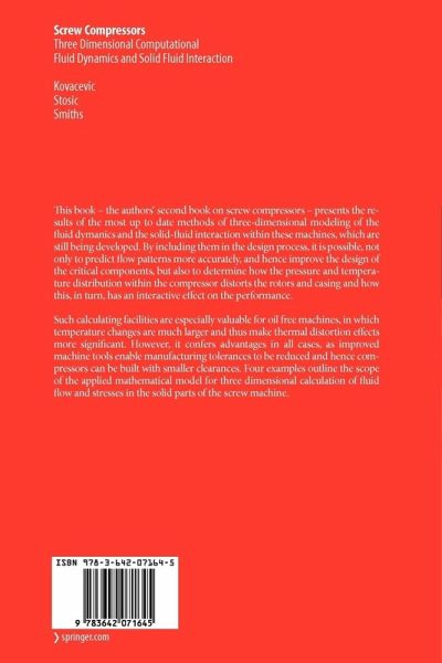 This book - the authors' second book on screw compressors - presents the results of the most up to date methods of three-dimensional modeling of the fluid dymanics and the solid-fluid interaction within these machines, which are still being developed. By including them in the design process, it is possible, not only to predict flow patterns more accurately, and hence improve the design of the critical components, but also to determine how the pressure and temperature distribution within the compressor distorts the rotors and casing and how this, in turn, has an interactive effect on the performance.