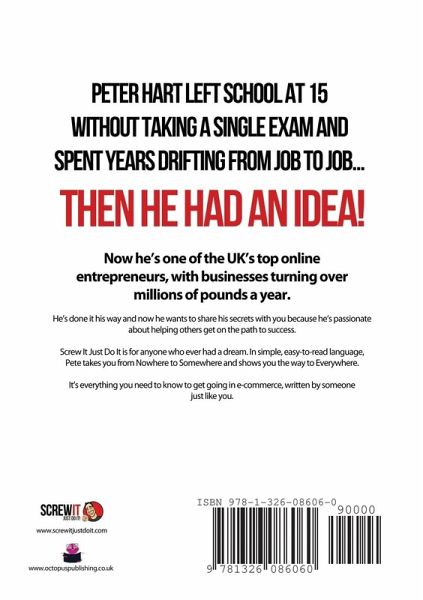 Peter Hart left school at 15 without taking a single exam and spent years drifting from job to job... then he had an idea! Now he's one of the UK's top online entrepreneurs, with businesses turning over millions of pounds a year. He's done it his way and now he wants to share his secrets with you because he's passionate about helping others get on the path to success. Screw It Just Do It is for anyone who ever had a dream. In simple, easy-to-read language, Pete takes you from Nowhere to Somewhere and shows you the way to Everywhere. It's everything you need to know to get going in e-commerce, written by someone just like you.