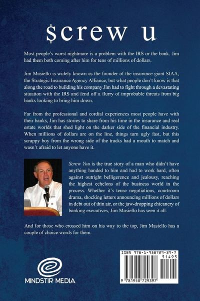 Most people's worst nightmare is a problem with the IRS or the bank. Jim had them both coming after him for tens of millions of dollars. Jim Masiello is widely known as the founder of the insurance giant SIAA, the Strategic Insurance Agency Alliance, but what people don't know is that along the road to building his company Jim had to fight through a devastating situation with the IRS and fend off a flurry of improbable threats from big banks looking to bring him down. Far from the professional and cordial experiences most people have with their banks, Jim has stories to share from his time in the insurance and real estate worlds that shed light on the darker side of the financial industry. When millions of dollars are on the line, things turn ugly fast, but this scrappy boy from the wrong side of the tracks had a mouth to match and wasn't afraid to let anyone have it. Screw You is the true story of a man who didn't have anything handed to him and had to work hard, often against outright belligerence and jealousy, reaching the highest echelons of the business world in the process. Whether it's tense negotiations, courtroom drama, shocking letters announcing millions of dollars in debt out of thin air, or the jaw-dropping chicanery of banking executives, Jim Masiello has seen it all.