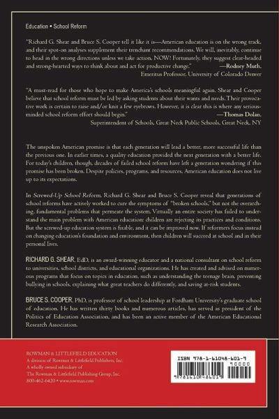 In Screwed-Up School Reform, Richard G. Shear and Bruce S. Cooper reveal that generations of school reforms have actively worked to cure the symptoms of "broken schools," but not the overarching, fundamental problems that permeate the system. Virtually an entire society has failed to understand the main problem with American education: children are rejecting its practices and conditions. But, the screwed-up education system is fixable, and it can be fixed now. If reformers focus instead on changing education’s foundation, then children will instead succeed at school and in their personal lives.