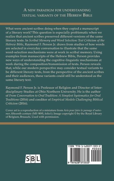 In Scribal Memory and Word Selection: Text Criticism of the Hebrew Bible, Raymond F. Person Jr. draws from studies of how words are selected in everyday conversation to illustrate that the same word-selection mechanisms were at work in scribal memory. Using examples from manuscripts of the Hebrew Bible, Person provides new ways of understanding the cognitive-linguistic mechanisms at work when scribes transmitted texts. Person reveals that, while our modern perspective may consider textual variants to be different literary texts, from the perspective of the ancient scribes and their audiences, these variants could still be understood as the same literary text.