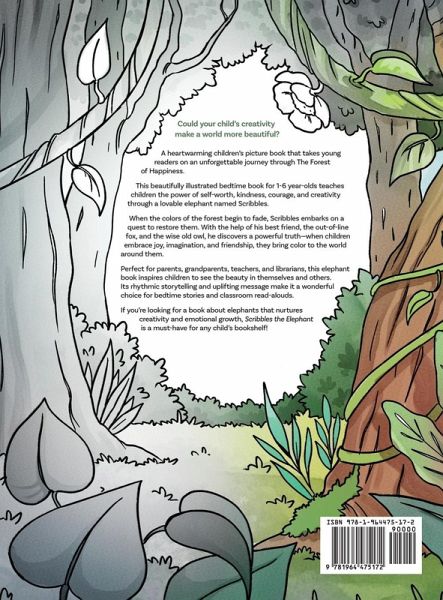 Could your child's creativity make a world more beautiful? A heartwarming children's picture book that takes young readers on an unforgettable journey through The Forest of Happiness. This beautifully illustrated bedtime book for 1-6 year-olds teaches children the power of self-worth, kindness, courage, and creativity through a lovable elephant named Scribbles. When the colors of the forest begin to fade, Scribbles embarks on a quest to restore them. With the help of his best friend, the out-of-line fox, and the wise old owl, he discovers a powerful truth-when children embrace joy, imagination, and friendship, they bring color to the world around them. Perfect for parents, grandparents, teachers, and librarians, this elephant book inspires children to see the beauty in themselves and others. Its rhythmic storytelling and uplifting message make it a wonderful choice for bedtime stories and classroom read-alouds. If you're looking for a book about elephants that nurtures creativity and emotional growth, Scribbles the Elephant is a must-have for any child's bookshelf! Make bedtime stories more magical-grab your copy of Scribbles the Elephant today!
