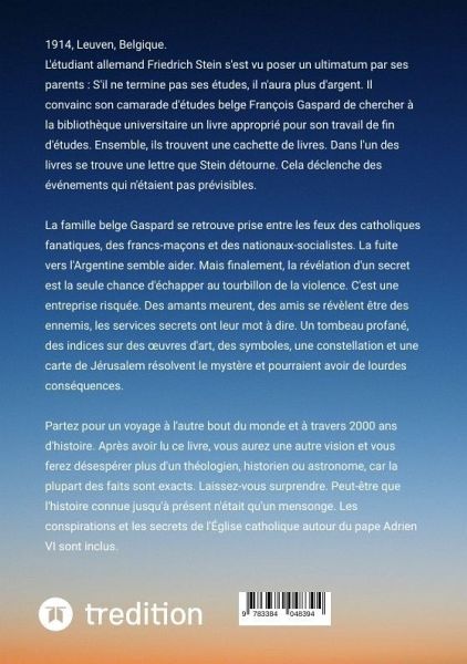 Un thriller politique au rythme narratif, où la fiction rencontre la réalité.Historique, plein de suspense et mystérieux : "ScribentOse savoir !" de Wolfgang Armin Strauch est un thriller politique hors du commun. Le synopsis : l'étudiant allemand Friedrich Stein s'est vu poser un ultimatum par ses parents : S'il ne termine pas ses études, il n'aura plus d'argent. Il convainc l'étudiant belge François Gaspard de chercher un livre pour son mémoire de fin d'études à la bibliothèque universitaire. Ensemble, ils trouvent une cachette de livres. Dans l'un des livres se trouve une lettre que Stein détourne. Cela déclenche des événements qui n'étaient pas prévisibles. La famille Gaspard se retrouve prise entre les feux des catholiques fanatiques, des francs-maçons et des nazis. La fuite vers l'Argentine semble aider. Mais finalement, la révélation d'un secret est la seule chance d'échapper au tourbillon de la violence.C'est une entreprise risquée. Des amants meurent, des amis se révèlent être des ennemis, les services secrets ont leur mot à dire. Un tombeau profané, des indices sur des oeuvres d'art, une constellation et une carte de Jérusalem résolvent le mystère.Partez pour un voyage à l'autre bout du monde et à travers 2000 ans d'histoire. Après avoir lu ce livre, vous aurez une autre vision et vous ferez désespérer plus d'un théologien, historien ou astronome, car la plupart des faits sont exacts.