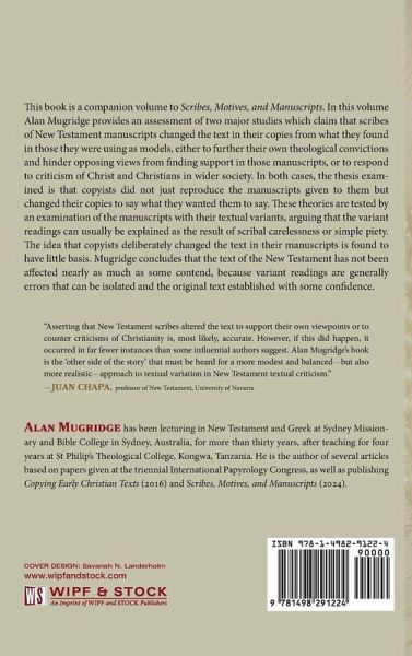 This book is a companion volume to Scribes, Motives, and Manuscripts. In this volume Alan Mugridge provides an assessment of two major studies which claim that scribes of New Testament manuscripts changed the text in their copies from what they found in those they were using as models, either to further their own theological convictions and hinder opposing views from finding support in those manuscripts, or to respond to criticism of Christ and Christians in wider society. In both cases, the thesis examined is that copyists did not just reproduce the manuscripts given to them but changed their copies to say what they wanted them to say. These theories are tested by an examination of the manuscripts with their textual variants, arguing that the variant readings can usually be explained as the result of scribal carelessness or simple piety. The idea that copyists deliberately changed the text in their manuscripts is found to have little basis. Mugridge concludes that the text of the New Testament has not been affected nearly as much as some contend, because variant readings are generally errors that can be isolated and the original text established with some confidence.