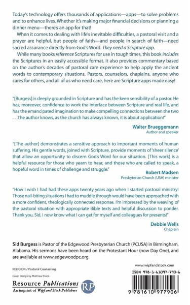 Today's technology offers thousands of applications--apps--to solve problems and to enhance lives. Whether it's making major financial decisions or planning a dinner menu--there's an app for that! When it comes to dealing with life's inevitable difficulties, a pastoral visit and a prayer are helpful, but people of faith--and people in search of faith--need sacred assurance directly from God's Word. They need a Scripture app. While many books reference Scriptures for use in tough times, this book includes the Scriptures in an easily accessible format. It also provides commentary based on the author's decades of pastoral care experience to help apply the ancient words to contemporary situations. Pastors, counselors, chaplains, anyone who cares for others, and all of us who need care, here are Scripture apps made easy!
