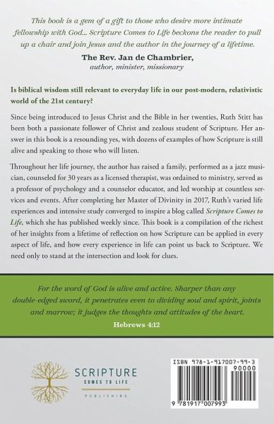This book is a gem of a gift to those who desire more intimate fellowship with God... Scripture Comes to Life beckons the reader to pull up a chair and join Jesus and the author in the journey of a lifetime. The Rev. Jan de Chambrier, author, minister, missionary Is biblical wisdom still relevant to everyday life in our post-modern, relativistic world of the 21st century? Since being introduced to Jesus Christ and the Bible in her twenties, Ruth Stitt has been both a passionate follower of Christ and zealous student of Scripture. Her answer in this book is a resounding yes, with dozens of examples of how Scripture is still alive and speaking to those who will listen. Throughout her life journey, the author has raised a family, performed as a jazz musician, counseled for 30 years as a licensed therapist, was ordained to ministry, served as a professor of psychology and a counselor educator, and led worship at countless services and events. After completing her Master of Divinity in 2017, Ruth's varied life experiences and intensive study converged to inspire a blog called Scripture Comes to Life, which she has published weekly since. This book is a compilation of the richest of her insights from a lifetime of reflection on how Scripture can be applied in every aspect of life, and how every experience in life can point us back to Scripture. We need only to stand at the intersection and look for clues. For the word of God is alive and active. Sharper than any double-edged sword, it penetrates even to dividing soul and spirit, joints and marrow; it judges the thoughts and attitudes of the heart. Hebrews 4:12
