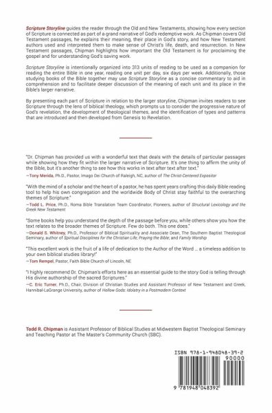 Scripture Storyline guides the reader through the Old and New Testaments, showing how every section of Scripture is connected as part of a grand narrative of God's redemptive work. As Chipman explains Old Testament passages, he explains their meaning, their place in God's story, and how New Testament authors use and interpret them to make sense of Christ's life, death, and resurrection. In New Testament passages, Chipman highlights how important the Old Testament was for proclaiming the gospel and for understanding God's saving work. Scripture Storyline is intentionally organized into 313 units of reading so it can be used as a companion for reading the entire Bible in one year, reading one unit per day, six days per week. Additionally, those studying books of the Bible together may use Scripture Storyline as a concise commentary to aid in comprehension and to facilitate deeper discussion of the meaning of each unit and its place in the Bible's larger narrative. By presenting each part of Scripture in relation to the larger narrative, Chipman invites readers to see Scripture through the lens of biblical theology, which prompts us to consider the progressive nature of God's revelation, the development of theological themes, and the identification of types and patterns that are introduced and then developed from Genesis-Revelation.