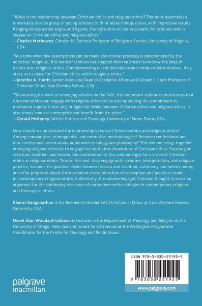 How should we understand the relationship between Christian ethics and religious ethics? Among comparative, ethnographic, and normative methodologies? Between confessional and non-confessional orientations, or between theology and philosophy? This volume brings together emerging religious ethicists to engage the normative dimensions of Christian ethics. Focusing on scripture, tradition, and reason, the contributors to this volume argue for a vision of Christian ethics as religious ethics. Toward this end, they engage with scripture, interpretation, and religious practice; examine the putative divide between reason and tradition, autonomy and heteronomy; and offer proposals about the normative characterization of conceptual and practical issues in contemporary religious ethics. Collectively, the volume engages Christian thought to make an argument for the continuing relevance of normative methodologies in contemporary religious and theological ethics.