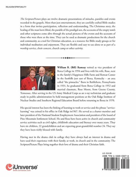 The ScripturePicture plays are twelve dramatic presentations of miracles, parables and events recorded in the gospels. More than just entertainment, they are carefully crafted Bible studies in a form that invites participation, reflection and understanding. The Christmas story, the healing of the man born blind, the parable of the prodigal son, the accounts of the empty tomb and other scriptures come alive through the actual pictures of the events and the accounts of those who were there at the time. They can be used as dramatic productions for the church and community, as a tool for Christian education, as a resource for Bible study groups or for individual meditation and enjoyment. They are flexible and easy to use alone or as part of a worship service, choir concert, church camp or other activity.