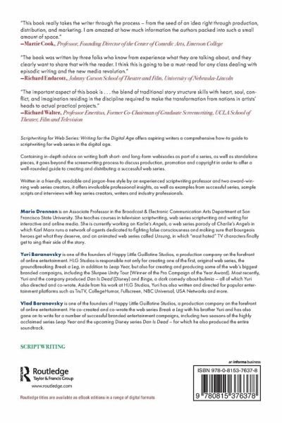 Marie Drennan is an Associate Professor in the Broadcast & Electronic Communication Arts Department at San Francisco State University. She teaches courses in television scriptwriting, web series scriptwriting and writing for interactive and online media. She is currently working on Karlie's Angels, a web series parody of Charlie's Angels in which Karl Marx runs a network of agents dedicated to fighting false consciousness and making sure that bourgeois heroes get what they deserve, and an animated web series called Unsung, in which "most hated" TV characters finally get to sing their side of the story. Yuri Baranovsky is one of the founders of Happy Little Guillotine Studios, a production company on the forefront of online entertainment. HLG Studios is responsible not only for creating one of the first, original web series, the groundbreaking Break a Leg, in addition to Leap Year, but also for creating and producing some of the web's biggest branded campaigns, including the Slurpee Unity Tour (Winner of the Pro Campaign of the Year award). Most recently, Yuri and the company produced Dan Is Dead (Disney) and Binge, a dark comedy about bulimia - all of which Yuri also directed and co-wrote. Aside from his work at HLG Studios, Yuri has also written and directed for popular entertainment platforms such as TruTV, CollegeHumor, Fullscreen, NBC Universal, USA Networks and more. Vlad Baranovsky is one of the founders of Happy Little Guillotine Studios, a production company on the forefront of online entertainment. He co-created and co-wrote the web series Break a Leg with his brother Yuri and has also gone on to write for a number of successful branded entertainment campaigns, including two seasons of the highly acclaimed series Leap Year and the upcoming Disney series Dan Is Dead - for which he also produced the entire soundtrack.