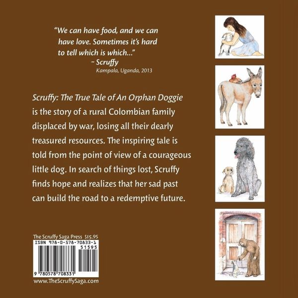 Scruffy, the True Tale of An Orphan Doggie is a gripping and heartwarming story narrated by a courageous little dog. Her family in rural Colombia is displaced by war and forced to flee from the homestead where they have lived for generations. As they slowly make their way to the city in search of sustenance the family suffers further downturns and are forced to sell their remaining possessions, including Jacobo the burro, Scruffy's dear friend. When her last protector, little Marta, takes ill and is rushed to a poor people's hospital, Scruffy is lost in the big city! In search of things gone, Scruffy endures adversity on the street until she is almost ready to give up. But in this depth of despair she finds hope, help, and love, and she learns that her sad past actually has built the road to a redemptive future.