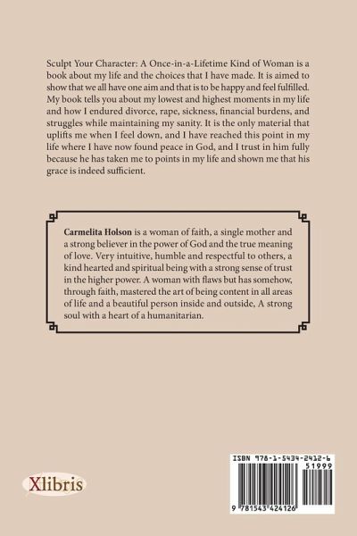 Sculpt Your Character: A Once-in-a-Lifetime Kind of Woman is a book about my life and the choices that I have made. It is aimed to show that we all have one aim and that is to be happy and feel fulfilled. My book tells you about my lowest and highest moments in my life and how I endured divorce, rape, sickness, financial burdens, and struggles with maintaining my sanity. It is the only material that uplifts me when I feel down, and I have reached this point in my life where I have now found peace in God, and I trust in him fully because he has taken me to points in my life and shown me that his grace is indeed sufficient.