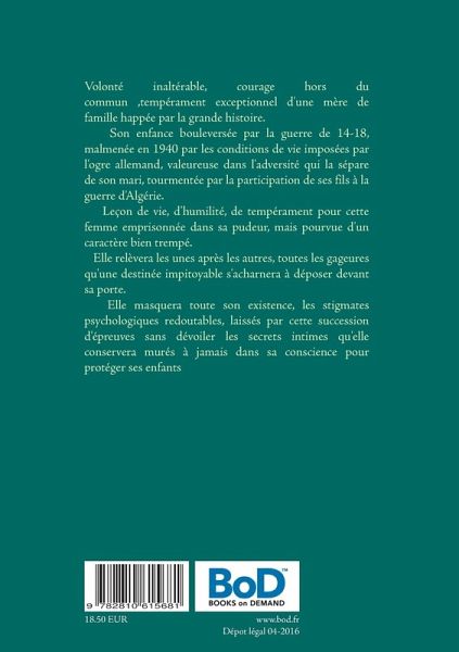 Volonté inaltérable, courage hors du commun, tempérament exceptionnel d'une mère de famille happée par la grande histoire.Son enfance bouleversée par la guerre de 14-18, malmenée en 1940 par les conditions de vie imposées par l'ogre allemand, valeureuse dans l'adversité qui la sépare de son mari, tourmentée par la participation de ses fils à la guerre d'Algérie.Leçon de vie, d'humilité, de tempérament pour cette femme emprisonnée dans sa pudeur, mais pourvue d'un caractère bien trempé.Elle relèvera les unes après les autres, toutes les gageures qu'une destinée impitoyable s'acharnera à déposer devant sa porte.Elle masquera toute son existence, les stigmates psychologiques redoutables, laissés par cette succession d'épreuves sans dévoiler les secrets intimes qu'elle conservera murés à jamais dans sa conscience pour protéger ses enfants