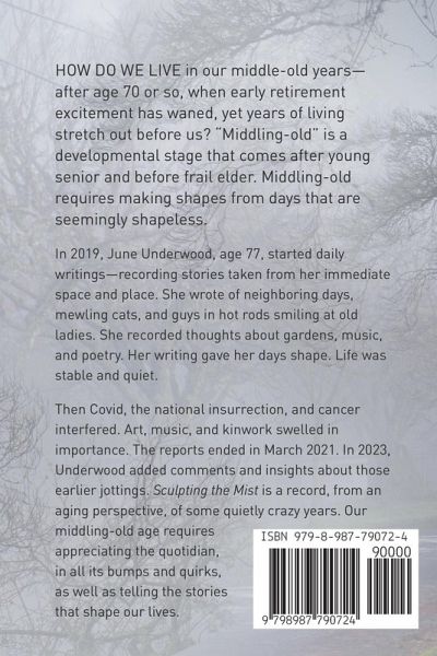 HOW DO WE LIVE in our middle-old years—after age 70 or so, when early retirement excitement has waned, yet years of living stretch out before us? "Middling-old" is a developmental stage that comes after young senior and before frail elder. Middling-old requires making shapes from days that are seemingly shapeless. In 2019, June Underwood, age 77, started daily writings—recording stories taken from her immediate space and place. She wrote of neighboring days, mewling cats, and guys in hot rods smiling at old ladies. She recorded thoughts about gardens, music, and poetry. Her writing gave her days shape. Life was stable and quiet. Then Covid, the national insurrection, and cancer interfered. Art, music, and kinwork swelled in importance. The reports ended in March 2021. In 2023, Underwood added comments and insights about those earlier jottings. Sculpting the Mist is a record, from an aging perspective, of some quietly crazy years. Our middling-old age requires appreciating the quotidian, in all its bumps and quirks, as well as telling the stories that shape our lives.