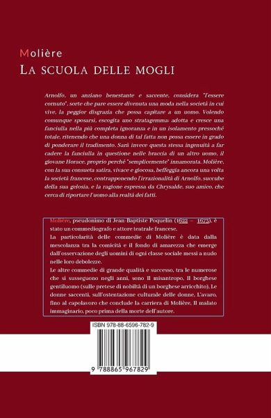 Arnolfo, un anziano benestante e saccente, considera "l'essere cornuto", sorte che pare essere divenuta una moda nella società in cui vive, la peggior disgrazia che possa capitare a un uomo. Volendo comunque sposarsi, escogita uno stratagemma: adotta e cresce una fanciulla nella più completa ignoranza e in un isolamento pressoché totale, ritenendo che una donna di tal fatta non possa essere in grado di ponderare il tradimento. Sarà invece questa stessa ingenuità a far cadere la fanciulla in questione nelle braccia di un altro uomo, il giovane Horace, proprio perché "semplicemente" innamorata. Molière, con la sua consueta satira, vivace e giocosa, beffeggia ancora una volta la società francese, contrapponendo l'irrazionalità di Arnolfo, succube della sua gelosia, e la ragione espressa da Chrysalde, suo amico, che cerca di riportare l'uomo alla realtà dei fatti.