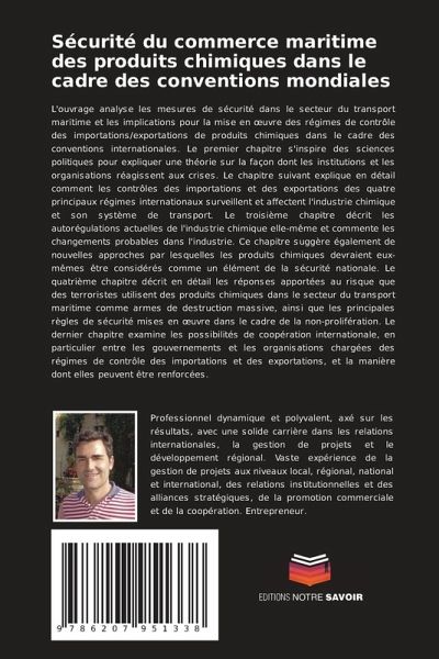 L'ouvrage analyse les mesures de sécurité dans le secteur du transport maritime et les implications pour la mise en oeuvre des régimes de contrôle des importations/exportations de produits chimiques dans le cadre des conventions internationales. Le premier chapitre s'inspire des sciences politiques pour expliquer une théorie sur la façon dont les institutions et les organisations réagissent aux crises. Le chapitre suivant explique en détail comment les contrôles des importations et des exportations des quatre principaux régimes internationaux surveillent et affectent l'industrie chimique et son système de transport. Le troisième chapitre décrit les autorégulations actuelles de l'industrie chimique elle-même et commente les changements probables dans l'industrie. Ce chapitre suggère également de nouvelles approches par lesquelles les produits chimiques devraient eux-mêmes être considérés comme un élément de la sécurité nationale. Le quatrième chapitre décrit en détail les réponses apportées au risque que des terroristes utilisent des produits chimiques dans le secteur du transport maritime comme armes de destruction massive, ainsi que les principales règles de sécurité mises en oeuvre dans le cadre de la non-prolifération. Le dernier chapitre examine les possibilités de coopération internationale, en particulier entre les gouvernements et les organisations chargées des régimes de contrôle des importations et des exportations, et la manière dont elles peuvent être renforcées.