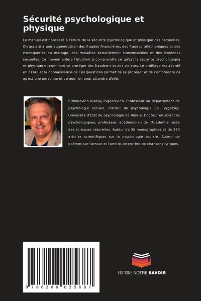 Le manuel est consacré à l'étude de la sécurité psychologique et physique des personnes. On assiste à une augmentation des fraudes financières, des fraudes téléphoniques et des escroqueries au mariage, des maladies sexuellement transmissibles et des violences sexuelles. Ce manuel aidera l'étudiant à comprendre ce qu'est la sécurité psychologique et physique et comment se protéger des fraudeurs et des violeurs. Le profilage est abordé en détail et la connaissance de ces questions permet de se protéger et de comprendre ce qu'est une personne et ce que l'on peut attendre d'elle.