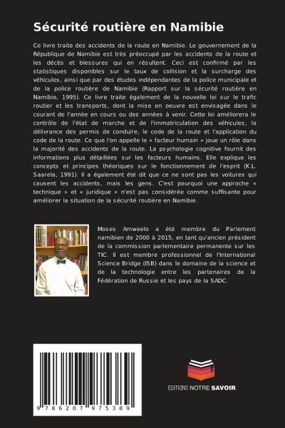 Ce livre traite des accidents de la route en Namibie. Le gouvernement de la République de Namibie est très préoccupé par les accidents de la route et les décès et blessures qui en résultent. Ceci est confirmé par les statistiques disponibles sur le taux de collision et la surcharge des véhicules, ainsi que par des études indépendantes de la police municipale et de la police routière de Namibie (Rapport sur la sécurité routière en Namibie, 1995). Ce livre traite également de la nouvelle loi sur le trafic routier et les transports, dont la mise en oeuvre est envisagée dans le courant de l'année en cours ou des années à venir. Cette loi améliorera le contrôle de l'état de marche et de l'immatriculation des véhicules, la délivrance des permis de conduire, le code de la route et l'application du code de la route. Ce que l'on appelle le « facteur humain » joue un rôle dans la majorité des accidents de la route. La psychologie cognitive fournit des informations plus détaillées sur les facteurs humains. Elle explique les concepts et principes théoriques sur le fonctionnement de l'esprit (K.L. Saarela, 1991). Il a également été dit que ce ne sont pas les voitures qui causent les accidents, mais les gens. C'est pourquoi une approche « technique » et « juridique » n'est pas considérée comme suffisante pour améliorer la situation de la sécurité routière en Namibie.