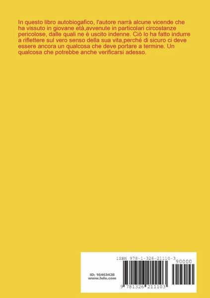 In questo libro autobiogafico, l'autore narrà alcune vicende che ha vissuto in giovane età,avvenute in particolari circostanze pericolose, dalle quali ne è uscito indenne. Ciò lo ha fatto indurre a riflettere sul vero senso della sua vita,perché di sicuro ci deve essere ancora un qualcosa che deve portare a termine. Un qualcosa che potrebbe anche verificarsi adesso.