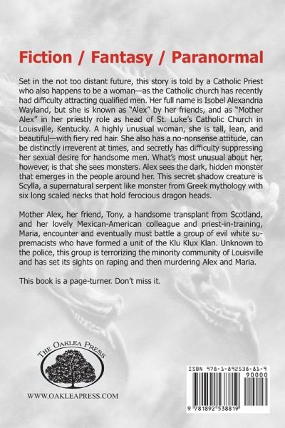 Set in the not too distant future, this story is told by a Catholic Priest who also happens to be a woman-as the Catholic Church has recently had difficulty attracting qualified men. Her full name is Isobel Alexandria Wayland, but she is known as "Alex" by her friends, and as "Mother Alex" in her priestly role as head of St. Luke's Catholic Church in Louisville, Kentucky. A highly unusual woman, she is tall, lean, and beautiful-with fiery red hair. She also has a no-nonsense attitude, can be distinctly irreverent at times, and secretly has difficulty suppressing her sexual desire for handsome men. What's most unusual about her, however, is that she sees monsters. Alex sees the dark, hidden monster that emerges in the people around her. This secret shadow creature is Scylla, a supernatural serpent like monster from Greek mythology with six long scaled necks that hold ferocious dragon heads. Mother Alex, her friend, Tony, a handsome transplant from Scotland, and her lovely Mexican-American colleague and priest-in-training, Maria, encounter and eventually must battle a group of evil white supremacists who have formed a unit of the Klu Klux Klan. Unknown to the police, this group is terrorizing the minority community of Louisville and has set its sights on raping and then murdering Alex and Maria. This book is a page-turner. Don't miss it.
