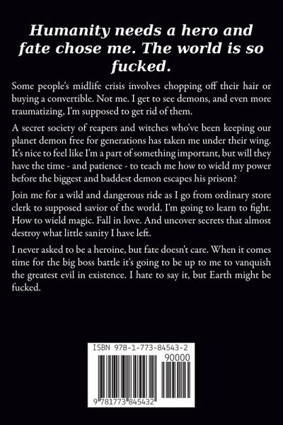 Humanity needs a hero and fate chose me. The world is so fucked. Some people's midlife crisis involves chopping off their hair or buying a convertible. Not me. I get to see demons, and even more traumatizing, I'm supposed to get rid of them. A secret society of reapers and witches who've been keeping our planet demon free for generations has taken me under their wing. It's nice to feel like I'm a part of something important, but will they have the time - and patience - to teach me how to wield my power before the biggest and baddest demon escapes his prison? Join me for a wild and dangerous ride as I go from ordinary store clerk to supposed savior of the world. I'm going to learn to fight. How to wield magic. Fall in love. And uncover secrets that almost destroy what little sanity I have left. I never asked to be a heroine, but fate doesn't care. When it comes time for the big boss battle it's going to be up to me to vanquish the greatest evil in existence. I hate to say it, but Earth might be fucked.