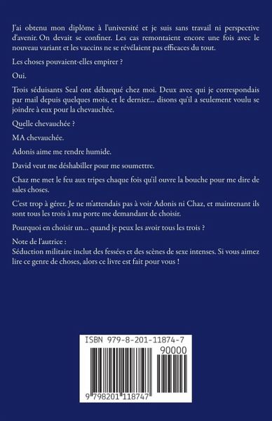 J'ai obtenu mon diplôme à l'université et je suis sans travail ni perspective d'avenir. On devait se confiner. Les cas remontaient encore une fois avec le nouveau variant et les vaccins ne se révélaient pas efficaces du tout. Les choses pouvaient-elles empirer ? Oui. Trois séduisants Seal ont débarqué chez moi. Deux avec qui je correspondais par mail depuis quelques mois, et le dernier… disons qu'il a seulement voulu se joindre à eux pour la chevauchée. Quelle chevauchée ? MA chevauchée. Adonis aime me rendre humide. David veut me déshabiller pour me soumettre. Chaz me met le feu aux tripes chaque fois qu'il ouvre la bouche pour me dire de sales choses. C'est trop à gérer. Je ne m'attendais pas à voir Adonis ni Chaz, et maintenant ils sont tous les trois à ma porte me demandant de choisir. Pourquoi en choisir un… quand je peux les avoir tous les trois ? Note de l'autrice : Séduction militaire inclut des fessées et des scènes de sexe intenses. Si vous aimez lire ce genre de choses, alors ce livre est fait pour vous !