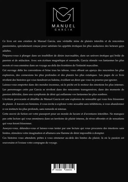 Ce livre est une création de Manuel Garcia, une véritable mine de plaisirs interdits et de rencontres passionnées, spécialement conçue pour satisfaire les appétits érotiques les plus audacieux des lecteurs gays adultes.Prépare-toi à te plonger dans un tourbillon de désirs inavouables, dans un univers érotique qui brûle de passion et de séduction. Avec son écriture magnétique et sensuelle, Garcia stimule tes fantasmes les plus secrets, t'emmenant dans un voyage au-delà des frontières de l'intimité masculine.Cet ouvrage défie les conventions et brise tous les tabous, t'offrant un aperçu des rencontres les plus explosives, des connexions les plus profondes et des plaisirs les plus extatiques. Les pages de ce livre révèlent des histoires qui te tiendront collé aux mots, éveillant un désir que tu ne pourras pas ignorer.Laisse-toi emporter dans des mondes inconnus, où le péché est le moteur des émotions les plus intenses. Les personnages créés par García se révèlent dans des rencontrestransgressives, dans des moments de passion débridée, dans une symphonie de désir qui enflamme tes fantasmes les plus sombres.L'écriture provocante et détaillée de Manuel García est une explosion de sensualité qui te fera frissonner de plaisir. À travers ses histoires, il t'invite à explorer ta sexualité sans inhibitions, à t'abandonner à tes instincts les plus profonds, sans remords ni retenue.Cette oeuvre de fiction est ton passeport pour un monde de luxure et d'aventures interdites. Ne manque pas cette lecture qui t'emmènera dans un territoire de plaisir intense, de rêves effrontés et de sensations qui te feront frissonner.Assieds-toi, détends-toi et laisse-toi aller à une lecture qui te procurera des émotions sans limites, stimulera ton imagination et allumera une flamme de désir qui ne peut être apprivoisée.Ces histoires t'attendent, prêtes à t'emmener au-delà des limites du plaisir, là où la passion est souveraine et où l'extase est ton compagnon de voyage.