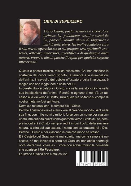 Questa è poesia mistica, mistica riflessione. Chi non conosce la nostalgia del cuore verso l'ignoto, il piangere dolce dell'anima, il travaglio del dubbio offuscatore della limpidezza, è meglio che non legga, non è cosa per lui. In questo libro si celebra il Cristo, sia nella sua storicità che nella sua inabitazione dell'anima. Perché in ognuno di noi c'è un accesso alla via verso il Cristo, sulla quale via soltanto si compie la nostra metamorfosi spirituale. Dove c'è resurrezione, c'è Cristo. Dove c'è resurrezione, lì sempre c'è il Cristo. Perché il cristianesimo è eterno, era al crear del mondo, sarà nella sua fine, con mille nomi o milioni, forse con un nome per ciascun uomo, ma quando quest'uomo guarderà verso il volto di Dio, sempre incontrerà il Cristo, sempre vedrà in Lui il volto della sua vera natura, la cifra del suo essere, il nome con cui presentarsi a Dio. Perché il Cristo è per ciascuno in qualche modo se stesso. E il Castello del Graal non è mai sparito, ma come sempre è nascosto, né mai lo vedrà o berrà dal Graal chi non abbia aperto gli occhi dell'anima, colui la cui voce non abbia trovato la domanda che guarisce il Re Pescatore. La strada tuttavia non è mai chiusa.