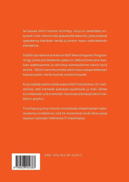 Se kasvaa mihin huomio kiinnittyy -kirja on tarkoitettu erityisesti niille intensiivistä ajatustyötä tekeville, jotka kokevat ajatustensa kiertävän kehää ja jonkun muun määrittelevän elämäänsä. Sisällön punaisena lankana on NLP (Neurolinguistic Programming), jonka yksi keskeinen ajatus on, että voimme aina muokata ajatteluamme ja vahvistaa elämässämme olevia hyviä asioita. Tällöin olemme entistä valmiimpia vastaanottamaan tulevaisuuden meille tuomat mahdollisuudet. Kirja sisältää useita mieltä avaavia NLP-harjoituksia. On mahdollista, että kiertävät ajatukset pysähtyvät ja mieli lähtee kiinnittämään yhä enemmän huomiota elämässä oleviin tärkeisiin asioihin. Tiina Pajula ja Anu Vihonen kirjoittavat omakohtaisten kokemustensa siivittäminä, sillä he molemmat olivat lähes palaa loppuun työssään hektisessä IT-maailmassa.