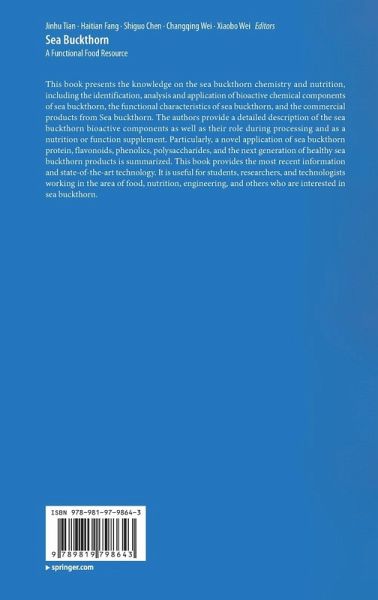 Chapter 1 Origin, distribution, germplasm and cultivation of sea buckthorn.- Chapter 2 Bioactive compounds from sea buckthorn.- Chapter 3 Current knowledge of the sea buckthorn composition and health benefits.- Chapter 4 Active substances and antioxidant activity of different solvent extracts of sea buckthorn leaves.-Chapter 5 Total flavonoids and total phenolics content in different parts of sea buckthorn.- Chapter 6 Chemical composition and pharmacological effects of flavonoids and phenolic from sea buckthorn.- Chapter 7 In vitro anti-inflammatory and antioxidant activities of flavonoids isolated from sea buckthorn.- Chapter 8 Hypolipidemic effect of flavonoids from sea buckthorn leaves.- Chapter 9 Gut microbe regulation of sea buckthorn for the metabolic syndrome.- Chapter 10 Bioactivities of sea buckthorn phenolics and their anti-cancer mechanism toward human breast cancer cells.- Chapter 11 Immunological enhancement effect of sea buckthorn powder.- Chapter 12 Research progress on extraction and functional activity of sea buckthorn proteins and polypeptides.- Chapter 13 Protein extraction process and anti-fatigue activity of sea buckthorn seed.- Chapter 14 Isolation purification and biological activity of polysaccharides from sea buckthorn.- Chapter 15 Chemical composition and antioxidant active components of sea buckthorn oil.- Chapter 16 Preparation technology of sea buckthorn essential oil microcapsules.- Chapter 17 Traditional Sea buckthorn-based functional food in China.- Chapter 18. Effect of sea buckthorn on the quality of fermented milk.- Chapter 19 Product development of sea buckthorn fruit wine.