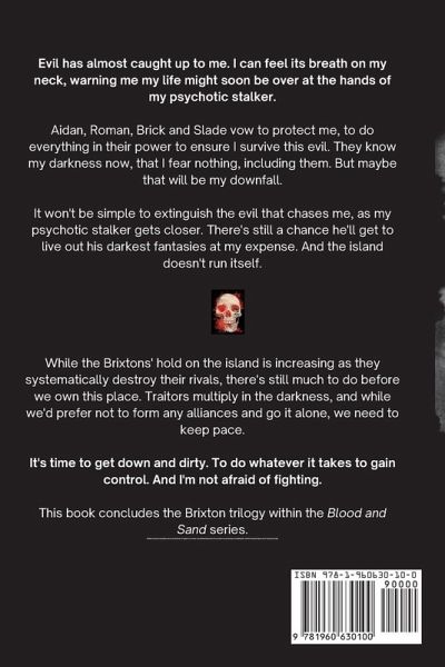 Evil has almost caught up to me. I can feel its breath on my neck, warning me my life might soon be over at the hands of my psychotic stalker. Aidan, Roman, Brick and Slade vow to protect me, to do everything in their power to ensure I survive this evil. They know my darkness now, that I fear nothing, including them. But maybe that will be my downfall. It won't be simple to extinguish the evil that chases me, as my psychotic stalker gets closer. There's still a chance he'll get to live out his darkest fantasies at my expense. And the island doesn't run itself. While the Brixtons' hold on the island is increasing as they systematically destroy their rivals, there's still much to do before we own this place. Traitors multiply in the darkness, and while we'd prefer not to form any alliances and go it alone, we need to keep pace. It's time to get down and dirty. To do whatever it takes to gain control. And I'm not afraid of fighting. This book concludes the Brixton trilogy within the Blood and Sand series.