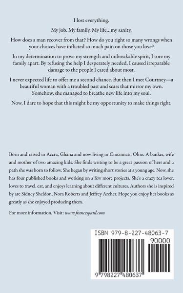 I lost everything. My job. My family. My life...my sanity. How does a man recover from that? How do you right so many wrongs when your choices have inflicted so much pain on those you love? In my determination to prove my strength and unbreakable spirit, I tore my family apart. By refusing the help I desperately needed, I caused irreparable damage to the people I cared about most. I never expected life to offer me a second chance. But then I met Courtney-a beautiful woman with a troubled past and scars that mirror my own. Somehow, she managed to breathe new life into my soul. Now, I dare to hope that this might be my opportunity to make things right.