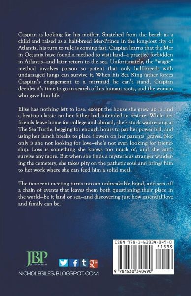 Caspian is looking for his mother. Snatched from the beach as a child and raised as a half-breed Mer-Prince in the long-lost city of Atlantis, his turn to rule is coming fast. When Caspian learns that the Mer in Oceania have found a method to visit land—a practice forbidden in Atlantis—and later return to the sea. Unfortunately, the "magic" method involves poison so potent that only half-breeds with undamaged lungs can survive it. When his Sea King father forces Caspian’s engagement to a mermaid he can’t stand, Caspian decides it’s time to go in search of his human roots, and the woman who gave him life. Elise has nothing left to lose, except the house she grew up in and a beat-up classic car her father had intended to restore. While her friends leave home for college and abroad, she’s stuck waitressing at The Sea Turtle, begging for enough hours to pay her power bill, and using her lunch breaks to place flowers on her parents’ graves. Not only is she not looking for love—she’s not even looking for friendship. Loss is something she knows too much of, and she can’t survive any more. But when she finds a mysterious stranger wandering the cemetery, she takes pity on the pathetic soul and brings him to her work where she can feed him a solid meal. The innocent meeting turns into an unbreakable bond, and sets off a chain of events that leaves them both questioning their place in the world—be it land or sea—and discovering just how essential love and family can be.